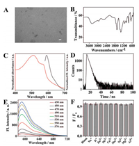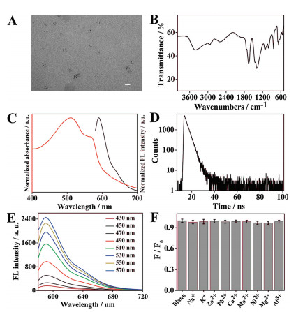 | Fig. 1. (A) TEM image of the CDs (scale bar: 20 nm). (B) FT-IR spectrum of the CDs. (C) Normalized absorption (red curve) and fluorescence spectra (black curve) of the CDs. (D) Fluorescence lifetime of the CDs. (E) Fluorescence spectra of CDs with different excitation wavelength. (F) Stability studies of the CDs in the presence of different metal ions. (F0 and F represented the intensity in the absence/presence of metal ions, respectively). | |