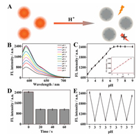 | Fig. 2. (A) Schematic illustration of the CDs-based biosensor for different pH value. (B) Fluorescence spectra of the CDs corresponding to different pH values. (C) Fluorescence intensity of CDs versus different pH values. Inset: Linear plot of FL intensity versus pH value. (D) Fluorescence intensity of CDs versus different incubation time. (E) Reversibility of fluorescence between pH 3 and pH 7. | |
