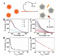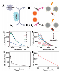 | Fig. 4. (A) Schematic illustration of the CDs-based biosensor for glucose biosensing. (B) The fluorescence spectra of the CDs under different conditions: (a) CDs, (b) CDs and KI, (c) CDs, KI and glucose, (d) CDs, KI and glucose oxidase, (e) CDs, KI, glucose oxidase and glucose. (C) The fluorescence spectra of the CDs corresponding to different concentrations of glucose. (D) Fluorescence intensity of CDs versus different glucose concentrations. (E) Linear plot of FL intensity versus the different concentrations of glucose. | |