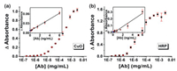 | Fig. 2. Comparison between (a) the proposed colorimetric Cu-DNAzyme immunoassay and (b) the standard HRP-based ELISA for human IgG. Inset: the signals (light absorbance) vs. low concentrations of analyte (human IgG), where the signals on yaxis (when [Ab] = 0 ng/mL) stand for the background noise level. | |