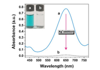 Numerous techniques, mainly including atomic absorption/emission spectroscopy [4], inductively coupled plasma mass spectrometry [5], inductively coupled plasma optical emission spectrometry [6], electrochemical methods [7, 8], surface-enhanced Raman spectroscopy [9], and fluorescence spectroscopy [10] have been employed to the determination of Ag+. Nevertheless, the range of their practical applications is severely limited by the requirements of expensive and non-portable instrumentations, elaborate sample preparation, time-consuming analysis, and skilled operators. In response to these shortcomings, colorimetric methods for Ag+ detection have been developed. This approach is extremely convenient, easy to be performed by inexpensive spectrophotometer or naked eyes, and do not need of professional operation. To date, plasmonic gold nanoparticles (GNPs) are the most commonly used optical nanomaterials for colorimetric sensing of Ag+ [11-15]. The GNPs-based colorimetric assays typically rely on distinct color changes of GNPs aggregation (or redispersion of GNPs aggregate) owing to their high extinction coefficients and strong surface plasmon resonance (SPR) absorptions in the visible region. However, in such assays, a complex modification of GNPs is usually necessary to obtain high selectivity towards Ag+, which significantly increases time and cost and thus restricts their applicability to some extent. Furthermore, most of current plasmonic GNPs-based colorimetric detection methods lack sufficient sensitivity. As a result, it is still a great challenge to develop simple but efficient method that can achieve sensitive and selective detection of Ag+.