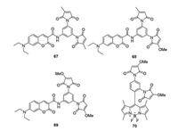 4.3. Methoxymaleimide groupsIn 2014, Keillor et al. [101] developed two novel dimaleimide probes (67 and 68, Fig. 12). probe 68 contained 7-diethylamino coumarin as the fluorophore and two different dimaleimide moieties. It exhibited a better selectivity with MBP-dC10α compared to probe 67, which suggested that the methoxymaleimide moiety has higher reactivity with the dC10α tag. Inspired by these results, they designed the probe 69 bearing two methoxymaleimide moieties, which induced obvious fluorescence signal (λex = 440 nm, λem = 485 nm) after reacted with MBP–dC10α (Fig. 12). HEK 293 T cells transfected with mNeptune–dC10α showed strong cyan fluorescence after incubated with the probe 69 and without any washing steps. The results confirmed that probe 69 was highly selective for dC10α and could be used as a non-wash labeling reagent in live cells.