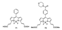 5. Diacrylate probesSite-specific labeling of target proteins with photophysical reporter probes allows numerous in vivo studies of protein functions. Fluorophores possessed dimaleimide groups have been sufficiently developed. Inspired by these dimaleimide probes, Chang et al. [103] designed and synthesized BODIPY-diacrylate probes (71 and 72, Fig. 13) for targeted proteins in live cells. Probe 71 comprised BODIPY-derivative and two acrylic acid groups. The space between the two acrylic groups was similar to the distance separating the two reactive cysteines in the peptide tag. probe 71 exhibited high selectivity towards a model peptide (P1, it had two cysteines at i and i+4 positions in an α-helix and was named as RC tag) and produced obvious fluorescent signal (λex = 480 nm, λem = 530 nm). In addition, they synthesized probe 72 consisted of two acrylic ester groups and morpholine at the para-position of the phenyl ring, which was used to specifically label RC-tagged Cherry and showed an apparent green fluorescence band (λex = 488 nm, λem = 526 nm) by SDS-PAGE. Furthermore, they used probe 72 as a fluorescent labeling reagent to image the RC2 tagged (the dimer of RC tag) recombinant proteins expressed in 293A cells. Dimeric peptide tag RC2 and its partner compound 72 enriched the current protein labeling methods, especially the optical imaging of specific target protein in live cells.