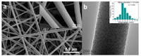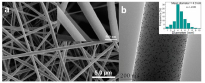 | Fig. 1. SEM image (a) and TEM image (b) of AgNPs/PNN hybrid nanofibrous membrane (Inset of (b) is the particle diameter distribution histogram of its embedded AgNPs). | |
