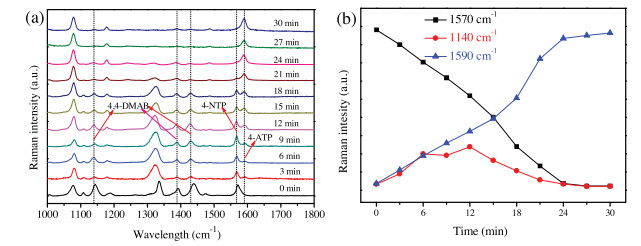 | Fig. 4. (a) Time dependent SERS spectra for monitoring the reduction of 4-NTP catalyzed by AgNPs/PNN hybrid nanofibrous membrane. (b) Kinetic trace of the SERS intensities of 1570 cm-1 peak (4-NTP), 1140 cm-1 peak (4, 4'-DMAB) and 1590 cm-1 peak (4-ATP). | |