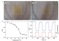 | Fig. 2. (a) Typical optical images of AgNPs/PNN hybrid nanofibrous hydrogel membrane immersed in 25 ℃ or 50 ℃ water; (b) Temperature dependent area of AgNPs/PNN hybrid nanofibrous membrane in water measured at a heating rate of 0.1 ℃/min; (c) Time dependent area of AgNPs/PNN hybrid nanofibrous membrane immersed alternately into the water of 25 ℃ or 50 ℃ after the interval of 2 min. | |
