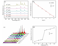 | Fig. 3. (a) SERS spectra of different concentrations of 4-NTP in aqueous solution based on AgNPs/PNN hybrid nanofibrous membrane as substrate with 532 nm laser excitation; (b) Plot of 1343 cm-1 peak intensity vs. log(c) of 4-NTP; (c) SERS spectra of 10-7 mol/L 4-NTP aqueous solution obtained on the membrane at different temperatures; (d) The 1343 cm-1 peak intensity as a function of temperature. | |