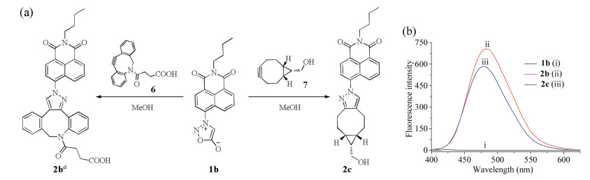 | Fig. 2. (a) Strain-promoted cycloadditions of Naph-Syd 1b. aOnly one regioisomer is depicted. (b) Fluorescence emission spectra of Naph-Syd 1b (curve ⅰ), Naph-Pyr 2b (curve ⅱ), and Naph-Pyr 2c (curve ⅲ) solutions of 1.1 × 10-5 mol/L in MeOH. | |