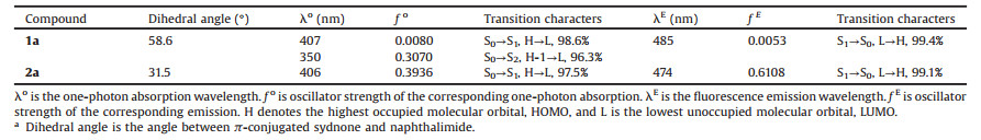 Before launching into experiments, we first predicted the photophysical properties of Naph-Syd 1a and its cycloaddition product 1, 8-naphthalimide substituted pyrazole (Naph-Pyr 2a, Fig. 1) using time-dependent density functional theory (TD-DFT) calculations. Based on the optimized geometries of 1a and 2a (Fig. S1 in Supporting information), the optical properties including the one-photon absorption and emission spectra for 1a and 2a were calculated in water at the B3LYP/6-31+G(d) level using the CPCM model. As listed in Table 1, the fluorescent emission of two molecules comes from the S1→S0 transition. For Naph-Syd 1a, the computed maximum emission wavelength is 485 nm, but the oscillator strength is very small, only 0.0053, indicating that 1a may be non-emissive. However, for Naph-Pyr 2a, the oscillator strength at its maximum emission wavelength of 474 nm is 0.6108, 115 times that of 1a. This shows that the strong fluorescence of 1, 8-naphthalimide would be restored after the cycloaddition of sydnone with alkyne to form pyrazole.