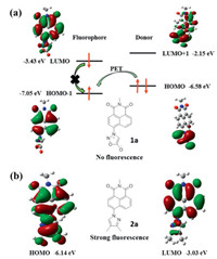 | Fig. 1. (a) Naph-Syd 1a and (b) Naph-Pyr 2a with their frontier molecular orbitals, and the illustration of the PET process for Naph-Syd 1a. | |