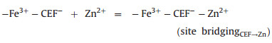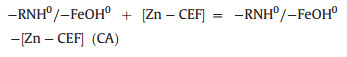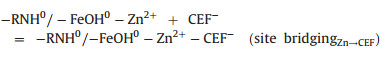 The impact of CEF on Zn(Ⅱ) was much different in the two modes (Fig. 3b): QZn increased with QCEF in the co-addition mode but decreased with it in the preloading mode. The inhibition effect in CEF preloading system directly ruled out the mechanism Eq. (8) in which Zn(Ⅱ) was bridged by the newly produced CEF site and Site-CEF-Zn ternary structures formed. Alternatively, we speculated that the promotion of Zn(Ⅱ) adsorption by CEF in bi-solute system was probably resulted from the electrostatic shielding of protonated amines (–+NH3, –+NH2– and –+NR–) by huge amount of CEF- anions. Further, more amines were available for Zn(Ⅱ) adsorption. The mechanism was similar to those in the promoted interaction between HMIs and polyamine-contained materials by inorganic anions (NO3-, SO42-, etc.) [15, 30]. Some may debate that Fe/N-CS could capture the [Zn-CEF] complex for preference in case of a higher affinity (Eq. (6)). However, if so, the promotion efficiency of CEF adsorption in co-addition mode should not be lower than that in the Zn preloading mode. Then, the inhibition of Zn(Ⅱ) adsorption by the preloading of CEF was easy to understand because part of the primary amine site was occupied by the CEF in advance and few anions contributed to the shielding effect. Besides, less than 1.0% of the preloaded CEF was detected during Zn adsorption probably because the replaced CEF was promptly bridged by Zn(Ⅱ).