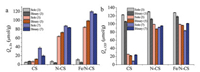 The adsorption of CEF onto the three adsorbents decreased at higher pH. As the pKa of carboxyl groups in CEF molecule was 3.0, most of CEF was in an anionic form at pH 6.0. The electrostatic force between CEF– and the protonated amines of CS mainly contributed in its adsorption. It significantly dropped at pH ≥ 5 because the amines deprotonated and the surface hydroxyls dissociated. Differently, N-CS and Fe/N-CS can retain high capacity to CEF at pH 5.0 and 7.0, much higher than those in CS group at the same conditions. The crosslinking effect of PEI and HFO not only consumed part of the hydroxyls in CS but also served as new active sites for CEF [23]. Moreover, N-CS and Fe/N-CS were able to simultaneously adsorb Zn and CEF without any obvious competition between them. In case of the same bi-solute systems, the total adsorption amount of Zn(Ⅱ) and CEF by Fe/N-CS was always highest at all the tested pH levels, 5.65 times and 1.28 times of that obtained by CS and N-CS, respectively, in maximum.