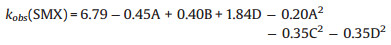 After the step-wise model fitting by the software, a response surface model for the SMX degradation in the Fered-FL/Ox system could be concluded as expressed by Eq. (1).
