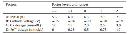 All experiments were conducted in a divided threeelectrodes cell reactor with a saturated calomel (SCE) reference electrode, a counter electrode of graphite rod (d = 6 mm), and the working electrode of Ti@TiO2 sheet (20 mm × 20 mm × 0.2 mm) which was pre-anodized with mixed solution of 0.5 mmol/L Fe3+ and 2 mmol/L Ox at a weak voltage for 10 min. 10 mmol/L sodium sulfate (Na2SO4) was chosen as the electrolyte. The Design-Expert 8.0.6 software (Stat-Ease Inc., USA) was used to design the experiments to conduct central composite design (CCD) and to establish response surface methodology RSM models for optimizing four main experiment parameters, i.e., initial pH, cathode voltage, dosage of Ox and Fe2+ at five levels. Upon the optimized parameters and neutral circumstance, attenuated total reflection Flourier transformed infrared spectroscopy (ATR-FTIR) and X-ray photoelectron spectroscopy (XPS) were used to explore the improved heterogeneous-homogenous degradation mechanism based on the Fered-FL/Ox system adopting the Ti@TiO2 electrode.