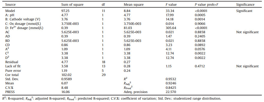 Table 2 variance (ANOVA) of the obtained model. It indicated that this model could be successfully applied for the SMX degradation in the Fered-FL/Ox system. The model value of "prob>F" and F value were < 0.05 and 33.34, respectively. This indicated that both the model terms and the model were significant were significant, there was only a 0.01% chance that a model value this large could occur due to noise. In addition, it should be noted that the "lack of fit P-value" was 0.4712 (>0.1000), suggesting that the lack of fit was not significant and the model had a good predictability. Besides, the value of R2 and "Adeq. precision" reached 0.9532 and 22.57 (>4), respectively, indicating that this model could be used to navigate the design space with an adequate signal and it had a good degree of fitting.