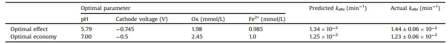 According to the expression (1), the results of different experimental parameters could be optimized under the remaining experimental conditions: 20 mg/L SMX, 10 mmol/L Na2SO4, 0.5 mmol/L PDS. As shown in Table 3, for achieving "the best degradation efficiency", the optimal parameters were predicted as pH of 5.79, cathode voltage of -0.745 V, Ox dosage of 1.98 mmol/L, Fe2+ dosage of 0.985 mmol/L, by set all related parameters "in range". An estimated value kobs (SMX) of 1.34 × 10-2 min-1 was obtained, which was close to the actual value of 1.44 ± 0.06 × 10-2 min-1 in the Fered-FL/Ox system. Another trial for achieving the target "the most cost-effective" was also calculated by the model, where the parameters were set as "pH equal to 7", "the cathode voltage minimize" (-0.5 V) and "others in range". The model estimated kobs(SMX) was 1.25 × 10-2 min-1 which was also very close to the related actual value of 1.23 ± 0.06 × 10-2 min-1. The above result indicated that the precision of the model was good enough in advising the degradation of pollutants in the Fered-FL/Ox system. In addition, optimal parameters of Ox dosage was 2.45 mmol/L, [Fe2+] dosage was 1.0 mmol/L for the case of "most cost-effective" were noted. The values were slightly higher than the case "best efficiency". It was because that the catalysis activity of FeⅡ-Ox complexes would be lower in the neutral circumstances than the acidic circumstances [19].