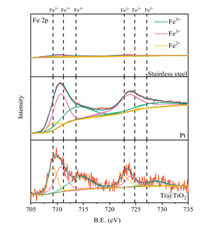 To reveal the interfacial reaction mechanism in the Fered-FL/Ox system depending on the Ti@TiO2 electrode, XPS and ATR-FTIR characterizations were conducted for the three adopted cathodes, which were pre-adsorbed for 10 min in the neutral solution of 0.5 mmol/L Fe3+ and 2 mmol/L Ox under a weak voltage of -0.01 V. Under the neutral conditions, Fe(C2O4)33- would be the dominate FeⅢ-Ox complex and would be absorbed to cathode and then may interact with specific cathode surface to accelerated the process of reduction. From Fig. 2, it can be seen that the obtained Fe 2p spectra of the three electrodes with pre-adsorbed FeⅢ-Ox were rather different. The case of the stainless steel electrode presented an extremely low intensity of Fe 2p indicating difficult adsorption of FeⅢ-Ox on its surface. As for the cases of Pt and Ti@TiO2, the two broad peaks (711.2 and 713.6 eV) and the small shoulder at 709.2 eV could be attributed to the adsorbed FeⅢ-Ox and its electrochemical reduction products FeⅡ-Ox, respectively [19, 20]. This result indicated that FeⅢ-Ox could be effectively adsorbed on the two cathodes surface and reduced. It was interesting to note that the intensity ratio of Fe2+/Fe3+on the Ti@TiO2 electrode increased significantly from 28.2% to 53.5% as compared to the Pt electrode. This indicated that the adsorbed FeⅢ-Ox species would be more easily electrochemically reduced depending on the Ti@TiO2 surface, probably due to TiO2 had more amounts of surface hydroxyl than Pt to combine with FeⅢ-Ox and then easily to start a reduction reaction at a weak voltage. As a result, the electron transportation between FeⅢ-Ox and the cathode could be accelerated.