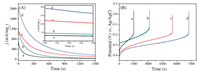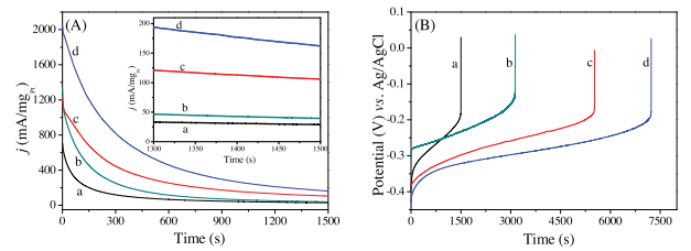 | Fig. 3. Chronoamperometric curves (A) at —0.2 V and chronopotentiometry curves (B) at 200 μA of Pt-Bi2WO6 (a, b) and Pt-Bi2WO6/MoS2 (c, d) in 1.0 mol/L CH3OH + 1.0 mol/L KOH solution under dark condition (a, c) and visible light irradiation (b, d). | |