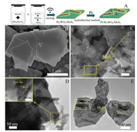 | Fig. 1. (A) Formation process of Pt-Bi2WO6/MoS2. SEM images of Bi2WO6 (B) and Bi2WO6/MoS2 (C). TEM images of Bi2WO6/MoS2 (D) and Pt-Bi2WO6/MoS2 (E). The insert in Fig. 1D is the HRTEM image of Bi2WO6/MoS2. | |