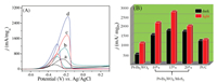 | Fig. 2. (A) 90th CVs of (a, b) Pt-Bi2WO6 and (c, d) Pt-Bi2WO6/MoS2 electrodes under dark (a, c) and visible-light irradiation (b, d) in 1.0 mol/L CH3OH/KOH solution. (B) Histogram of activities of different electrodes in photo-assisted electrocatalytic MOR under visible-light and dark conditions. | |