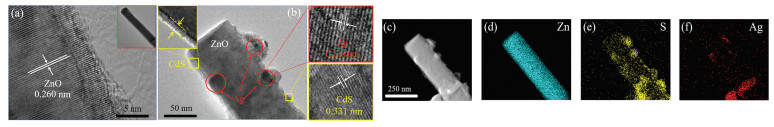 | Fig. 2. TEM and HRTEM images of (a) pure ZnO, (b) CdS/Ag/ZnO; (c–f) elemental mappings of CdS/Ag/ZnO. | |