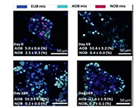 | Fig. 5. Fluorescence in situ hybridization (FISH) images during the partial nitritation-SBR operation. Semi-quantification was based on a minimum of n = 30. Copied with permission [123]. Copyright 2019, Elsevier. | |