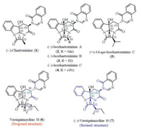 Efficiency is the major concern of contemporary organic synthesis [1]. Tandem/cascade/domino reaction [2] is an effective strategy to achieve high efficiency. (−)-Chaetominine (1 in Fig. 1) is a hexacyclic fungal tripeptidal alkaloid isolated from endophytes of different origins. Following the isolation of chaetominine [3], its homologues and diastereomers (−)-isochaetominines A–C (2–4) and (+)-14-epi-isochaetominine C(5) were isolated from the solid-substrate culture of an Aspergillus sp. Fungus [4]. In 2016, Lin and coworkers reported that during a screening of their marine microorganism library, the gorgonian (Pseudopterogorgia sp.)-derived fungus Aspergillus versicolor LZD-14-1 was found to possess inhibitory effects against thioredoxin reductase (TrxR), a potential target for the treatment of cancer, AIDS and autoimmune diseases. The investigation led to the isolation of eleven new fumiquinazoline-type alkaloids named versiquinazolines A–K [5]. Among them, (−)-versiquinazoline H(6, the structure displayed in the original paper [5]) also belongs to the chaetominine family. Its relative stereochemistry was determined by 2D NMR techniques, and the absolute configuration was determined to be 14S, 16S, 17S, 26R (referring to 2S, 3S, 11R, 14S according to the numbering system used for compounds 1–4) based on the comparison with the known compound (–)-isochaetominine C(4) [6], and on a comparison of the experimental ECD data with those of calculated for 6 and its enantiomer. On the other hand, the configuration of the isoleucine (Ile) unit was determined to be l by analysis of the degradation product.