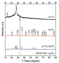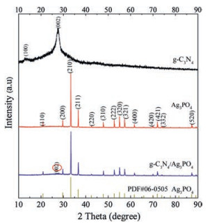 | Fig. 1. XRD patterns of the as-prepared g-C3N4 nanosheets, Ag3PO4, g-C3N4/Ag3PO4 composite. | |