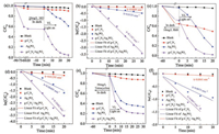 | Fig. 4. (a) Relative concentration (C/C0) of MO (10 mg/L) versus time under visible light irradiation. (b) The corresponding plots of ln(C/C0) versus time of (a). (c) Relative concentration (C/C0) of RhB (10 mg/L) versus time. (d) the corresponding plots of ln(C/C0) versus time of (c). (e) Photocatalytic degradation of 50 mg/L TC by as-fabricated photocatalysts. (f) The pseudo-first-order reaction kinetics for the degradation of 50 mg/L TC with prepared samples. | |
