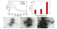 | Fig. 3. (A) UV–vis absorption spectra, (B) hydrodynamic diameter and (C–E) TEM images of AgNPs-M13 phage composite with/without the addition of Cr(Ⅲ). C: without Cr(Ⅲ); D: added 0.20 μmol/L Cr(Ⅲ); E: added 0.50 μmol/L Cr(Ⅲ). Phages were negatively stained by phosphotungstic acid. | |