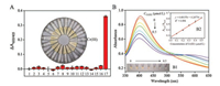 | Fig. 4. (A) Selectivity studies of the AgNPs-M13 phage composite towards Cr(Ⅲ). Concentrations of metal ions are listed as: 1. Na+, 2. K+, 3. Mg2+, 4. Ca2+, 5. Ba2+, 7. Mn2+, 9. Co2+, 10. Ni2+, 13. Cd2+: 10.00 μmol/L; 6. Cr(Ⅵ), 11. Cu2+, 12. Zn2+, 14. Hg2+: 4.00 μmol/L; 8. Fe3+: 3.00 μmol/L; 16. Pb2+: 1.00 μmol/L; 15. Al3+, 17. Cr(Ⅲ): 0.40 μmol/L. The inset shows the color photograph of the corresponding solutions. (B) UV–vis absorption spectra of the AgNPs-M13 phage composite with the addition of Cr(Ⅲ) with various concentrations (0, 0.02, 0.10, 0.20, 0.30, 0.40, 0.50 μmol/L). Inset B1 shows the color photograph of the corresponding solutions. Inset B2 shows the response of absorbance ratio (A600/A405) of the colorimetric assay system versus Cr(Ⅲ) concentrations. | |