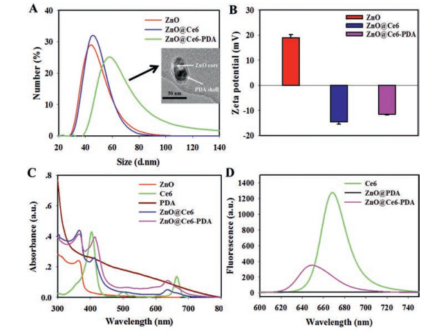 | Fig. 2. (A) DLS measurements of different samples. Inset: Magnified image of a single ZnO@Ce6-PDA. (B) Zeta potentials of different samples. (C) UV-vis absorption spectra of different samples. (D) The fluorescence spectra of different samples. | |
