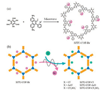 | Fig. 1. Schematic representation of (a) the microwave-assisted synthesis of SJTU-COF-Br and (b) the microwave-assisted anion exchange in SJTU-COFs. | |