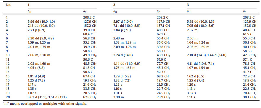 Compound 1 was obtained as colorless block crystals, and its molecular formula was deter mined to be C20H30O3, by the analysis of HRESIMS data at m/z 341.2127 [M+Na]+ (calcd. for C20H30O3Na+: 341.2087), corresponding to six degrees of unsaturation. The IR spectrum shows an absorption band for the OH group (3413 cm–1). By analysis of its 1H, 13C and DEPT NMR data (Table 1) and in association with the HSQC spectrum, 20 carbons resonances were observed, including four methyls (δH 1.25/δC 19.1, δH 1.07/δC 20.5, δH 1.17/δC 21.6, δH 1.35/δC 33.5), five sp3 methylenes (δC 35.2, 39.9, 48.5, 49.9, 67.8), six methines (δH 2.73/δC 39.0, δH 2.30/δC 56.8, δH 1.81/δC 67.4, δH 4.05/δC 81.8, δH 5.96/δC 127.9, δH 7.13/δC 157.2), and five quaternary carbons (δC 50.6, 50.6, 58.8, 60.4, 208.2). Apart from two degrees of unsaturation occupied by two olefinic carbons (δC 127.9 and 157.2) and a carbonyl carbon (δC 208.2), a tetracyclic ring system should exist in compound 1.