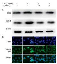 | Fig. 4. (A) Effects of Compound 1 on the protein expression levels of iNOS and COX-2 in RAW264.7 cells stimulated with LPS. (B) NF-κB p65 activation level in RAW264.7 cells stimulated with LPS. The cells were pretreated for 2h with the indicated concentrations of 1 and stimulated for 12h with LPS (1μg/ mL). | |