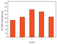 Last but not the least, the cycling stability of Cu@MOR-A3 was investigated. Five DMTM cycles were performed, it can be seen from Fig. 4 that very high and stable CH3OH production of 117 ± 28 μmol/g was maintained during the cycles. The sample after stability test was characterized by XRD and SEM (Fig. 5), no degradation on phase structure and morphology was noticed. These results demonstrated the great promise of the Cu@MOR-A3 for further DMTM studies.