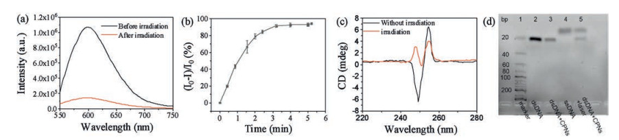 | Fig. 1. (a) Fluorescence spectra of the EB with dsDNA and imidazole-CPNs in the presence of CO2 before and after 808 nm NIR laser irradiation for 2.5 min. The power density was 2.0 W/cm2. (b) Fluorescence intensity of EB with dsDNA and imidazole-CPNs in the presence of CO2 as a function of NIR irradiation time. I0 indicates the fluorescence intensity of EB without irradiation and I indicates the fluorescence intensity of EB with irradiation. The excitation wavelength of EB was 485 nm. Error bars were calculated as standard deviations of data from three separate measurements. [dsDNA] = 0.27 μmol/L, [EB] = 0.70 μg/mL, [imidazole-CPNs] = 15.0 μg/mL. (c) CD spectra of dsDNA before and after NIR irradiation in the presence of imidazole-CPNs and CO2. [dsDNA] = 0.27 μmol/L, [imidazole-CPNs] = 15.0 μg/mL. (d) Agarose gel electrophoresis (4%) analysis of dsDNA before and after NIR irradiation in the presence of imidazole-CPNs and CO2. [dsDNA] = 0.20 μmol/L, [imidazole-CPNs] = 15.0 μg/mL, [ssDNA] = 0.30 μmol/L. | |