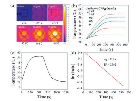 | Fig. 2. (a) Infrared thermal images of imidazole-CPNs aqueous solution with various concentrations exposed to 808 nm laser irradiation for 10 min. (b) Temperature profiles of imidazole-CPNs aqueous solution with various concentrations versus irradiation time. The power density was 2.0 W/cm2. (c) Temperature elevation of imidazole-CPNs (15.0 μg/mL) under 808 nm irradiation (2.0 W/cm2, 600 s), followed by subsequent cooling to room temperature. (d) Time constant for heat transfer was determined to be τs = 110 s by applying the linear time data from the cooling period (after 600 s) versus negative natural logarithm of driving force temperature, which is obtained from the cooling stage of (c). | |