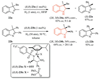 In 2016, the Fan group found that a kinetic resolution of 3-H-indoles 22a, 22b bearing different substituents at C3 position could be realized by asymmetric hydrogenation [14]. Under the optimized reaction conditions, two hydrogenated products (2R, 3R)-24a (83% ee), (2R, 3R)-24b (64% ee) as well as two recovered chiral substrates (S)-22a and (S)-22b were obtained with excellent enantioselectivity (97% ee and 93% ee) (Scheme 6).