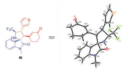 We further examined the generality of the asymmetric [3 + 2] cycloaddition to various cyclic 2, 4-dienones. As shown in Scheme 3, a wide range of cyclic 2, 4-dienones with different electronic and structural substituents were well tolerated in this transformation. For electron-donating groups (Me, MeO and tBu) substituted dienones at δ-position of aromatic ring, the cycloaddition proceeded smoothly and provided corresponding products in good to excellent yields and high stereoselectivities (Scheme 3, 4i, 4j, 4l). With respect to the electron-withdrawing groups, such as cyano group, sulfonyl group and halogens, similar results were obtained (4m-4q). Bulky reactant with gem-dimethyl group on the cyclohexanone underwent the conversion efficiently, delivering 4r in 83% yield and excellent stereocontrol (95% ee, >19:1 dr). Remarkably, when the aromatic moiety was replaced by ester group, the cycloaddition also revealed good yield and excellent enantioselectivity, albeit with moderate diastereoselectivity (4s). The δ-thiofuran substituted cyclic 2, 4-dienone was also the suitable dipolarophile and constructed enantioenriched heteroaryl derivative 4t. The absolute configuration of 4t was determined by X-ray crystallographic analysis (Fig. 2).