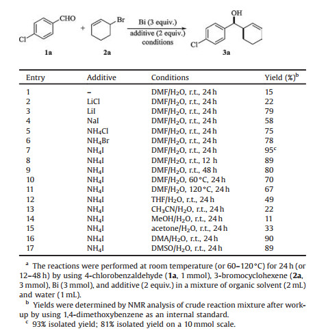At the outset, the model reaction involving 4-chlorobenzaldehyde (1a) and 3-bromocyclohexene (2a) was performed in the presence of bismuth (3 equiv.) and various additives (2 equiv.) in aqueous DMF at room temperature for 24 h, attempting to find the optimum reaction conditions. As summarized in Table 1, among the several additives screened (such as LiCl [14], LiI [15], NaI [16], NH4Cl [17], NH4Br [18], and NH4I [19]; entries 2–7), the use of NH4I as reaction additive afforded the desired product 3a with the highest product yields (95% NMR yield, 93% isolated yield; entry 7). In sharp contrast, the reaction proceeded sluggishly in the absence of an additive (entry 1). It should be mentioned that the use of LiI, NH4Cl, and NH4Br as reaction additive also delivered the product 3a in reasonable yields (entries 3, 5, and 6). By using NH4I as optimum reaction additive, it was observed that conducting the reactions with reduced or prolonged reaction time led to decreased product yield (entries 8 and 9). Moreover, the addition reactionwas found to be sensitive to temperature, as eroded reaction performance was detected when the reactions were carried out at elevated temperature (entries 10 and 11). Furthermore, survey of other aqueous solvent systems showed that the reactions worked more efficiently in aqueous media containing more polar organic solvents (DMA and DMSO; entries 16 and 17) than in aqueous media using relatively less polar organic solvents (THF, CH3CN, etc.; entries 12–15). In view that the highest product yield was obtained by employing DMF/H2O as reaction media, thus the following reactions were performed in aqueous DMF by utilizing NH4I as reaction additive (entry 7). More importantly, the desired product 3a was obtained with excellent diastereoselectivity (>99:1 syn:anti) under the optimized reaction conditions, with the formation of syn-3a as the exclusive diastereomer. Additionally, a 10 mmol scale of the model reaction by using 1.4 g aldehyde 1a could also work with a good efficiency to provide the corresponding product 3a in 81% yield (entry 7, footnote c).