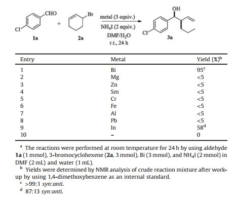 In summary, an efficient bismuth-mediated addition reaction of cyclic allylic halide with aldehyde was developed. The reactions employing a variety of structurally varied aldehydes proceeded efficiently in the presence of bismuth and ammonium iodide in aqueous media at room temperature, leading to the desired products of homoallylic alcohols in modest to high yields with compatibility to various functional groups. Bismuth was found to be the mediator of choice among the several metals evaluated. In case where cinnamyl aldehyde and substrate 1n were used as electrophiles, the addition reactions occurred regioselectively at the formyl group, leaving C—C double bond and acetyl group untouched. More importantly, the reactions proceeded with exclusive diastereoselectivity to afford the corresponding homoallylic alcohols as syn-diastereomer. Only in a case where aldehyde of 6-bromopicolinaldehyde containing an adjacent chelating nitrogen atom was used, the reaction proceeded with the inversion of diastereoselectivity to afford the desired product as anti-diastereomer.