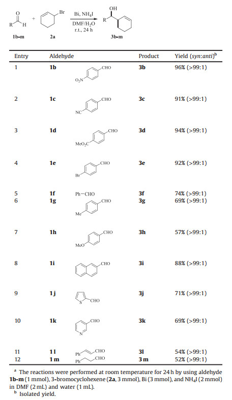 Subsequently, the substrate scope of the addition reaction was evaluated by applying the optimized reaction conditions (Bi, NH4I, DMF/H2O, r.t., 24 h) to a wide variety of aldehydes in aqueous media. As listed in Table 3, the addition reactions employing various aldehydes proceeded smoothly to furnish the corresponding homoallylic alcohols in modest to good yields. Generally, the reaction worked with enhanced performance by using aryl aldehydes 1b-e bearing electron-withdrawing groups (entries 1–4) than by utilizing aryl aldehydes 1g-h containing electron-donating substituents (entries 6 and 7). 2-Thiophenecarboxaldehyde (1j) and 3-pyridinecarboxaldehyde (1k) possessing heteroatoms worked with equal success to produce the expected products 3j-k in good yields (69%–71% yields; entries 9 and 10). In the case of α, β-unsaturated aldehyde of cinnamyl aldehyde (1l), the addition reaction proceeded regioselectively at the C–O double bond, leaving the C—C double bond untouched (entry 11). As for less reactive alkyl substituted aldehyde of 3-phenylpropanal (1m), an acceptable yield of 52% was obtained for the anticipated product 3m (entry 12). Moreover, the reaction proved compatible with functional groups such as nitro, cyano, methoxycarbonyl, and bromide (entries 1–4).