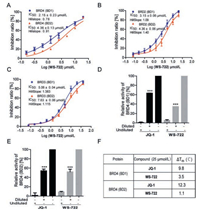 | Fig. 2. Biochemical characterization of WS-722. (A, B, C) Inhibitory activity of WS-722 against BRD2/3/4 (BD1) and BRD2/3/4 (BD2); (D) Dilution assay of WS-722 to BRD4 (BD1) with TR-FRET assay, (+)-JQ1 was used as the positive control; (E) Dilution assay of WS-722 to BRD4 (BD2) with TR-FRET assay, (+)-JQ1 was used as the positive control; (F) BRD4 (BD1) and BRD4 (BD2) recombinant protein thermal shift assays were performed when treated with WS-722 and (+)-JQ1. d(Fluorescence)/dT and △Tm was analyzed. Data are the mean ± SD. Each experiment was repeated three times. *** P < 0.001. | |