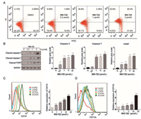 | Fig. 4. Effect of WS-722 on cell apoptosis and differentiation in THP-1 cell line. (A) THP-1 cell apoptosis when treated with WS-722 at doses from 0.3 μmol/L to 3.0 μmol/L for 48 h. (B) Cleaved caspase-3, caspase-7 and PARP expression when treated with WS-722 for 48 h. (C and D) Flow cytometry analysis of CD11b (C) and CD14 (D) in THP-1 cells treated with WS-722. Data are the mean ± SD. Each experiment was repeated three times. * P < 0.05; ** P < 0.01; *** P < 0.001. | |