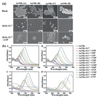According to the previously reported seed-mediated method [37], AuNRs with four different aspect ratios were prepared by adjusting the amount of reagents in the synthesis process. The LPRA bands located at 693 nm, 722 nm, 744 nm, and 902 nm (Fig. S1a in Supporting information) and the corresponding aspect ratios of AuNRs were 2.3, 2.9, 3.1 and 4.5, respectively (Fig. S1b in Supporting information). The SEM images of etched AuNRs (Fig. 1a) displayed that in the presence of H2O2 and Fe2+, the morphology of AuNRs changed from rod-shape to sphere. After introducing ATP, the morphology of AuNRs restored to a rod shape, indicating that ATP can bind with Fe2+ and hinder the etching process of AuNRs.