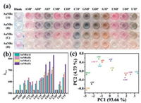 Ribonucleotides species are one linchpin in biological field, which play vital roles in physiological processes such as energy supply, metabolism, and transmission of genetic information in organisms [1]. For example, guanosine triphosphate (GTP) is involved in the synthesis of RNA, DNA proteins and intracellular nutrient metabolism [2, 3]. Adenosine diphosphate (ADP) plays an important role in the fundamental biological reactions catalyzed by adenosine triphosphatase (ATPases) and kinases [4]. Moreover, these small biomolecules often functioned as biomarkers to diagnose diseases and monitor the life activities in living organisms. Therefore, sensors for physiological ribonucleotides are of vital importance for investigating the metabolic processes and diseases diagnosis. With this issue in mind, great efforts have been devoted to developing sensitive and selective methods for ribonucleotide detection in the past decades, including fluorome-try [5-7], spectrophotometry [8], nuclear magnetic resonance spectroscopy [9], chromatography [10], electrochemical analysis [11, 12], and aptamer-based optical sensing [13], and so on. These methods can only selectively detect one kind of ribonucleotide and/or require sophisticated instrumentation, and just few attempts have been reported for distinguishing twelve ribonucleotides at the same time. Accordingly, the development of simple, rapid, and novel strategies for large-scale determination of ribonucleotides is highly desirable.