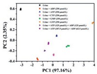To guarantee the feasibility of the proposed sensor array in accessible biofluids, urine samples were collected from healthy people, and added the following ribonucleotides and their mixtures to the urine sample, ADP, ATP, CTP, GMP, GTP, ATP + ADP (molar ratios = 1:1), ATP + ADP (molar ratios = 3:1). The results of PCA plots (Fig. 3) indicate that urine samples without ribonucleotides produce their own unique signals, while urine samples containing different ribonucleotides showed unique PCA signals. At the same time, it was found that the mixtures samples also had unique PCA signals, and the regions did not overlap, indicating that the method can be used to distinguish the ribonucleotides in urine samples.