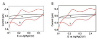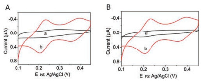 | Fig. 3. Cyclic voltammetry curves: (A) reaction of 0.9% NaCl solution with molybdate (curve a), reaction of dead cell supernatant with molybdate (curve b); (B) reaction of living cell supernatant with molybdate (curve a) and reaction of dead cell supernatant with molybdate (curve b). | |