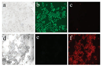 | Fig. 1. Fluorescence inverse microscope images of hela cells: (a) Living cells under bright light; (b) Fluorescence from SYTO-9 in living cells; (c) Fluorescence from PI in living cells; (d) Dead cells under bright light; (e) Fluorescence from SYTO-9 in dead cells; (f) Fluorescence from PI in dead cells. | |